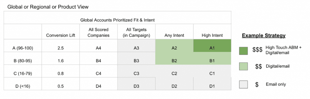 A Company Fit or propensity model can help answer this by determining which of the intent-surging accounts are the best fit for your company. These models analyze historical data and Ideal Customer Profile (ICP) attributes across your TAM, leveraging AI-driven algorithms to score accounts based on various buying signals. This scoring helps identify not only which accounts are most likely to purchase now but also those that could be potential buyers in the future. Fit models play a crucial role in prioritizing accounts for investment, ensuring that campaign budgets and sales resources are directed toward opportunities with the highest likelihood of conversion. The best candidates for high-touch engagement are those with strong Fit and Intent scores.